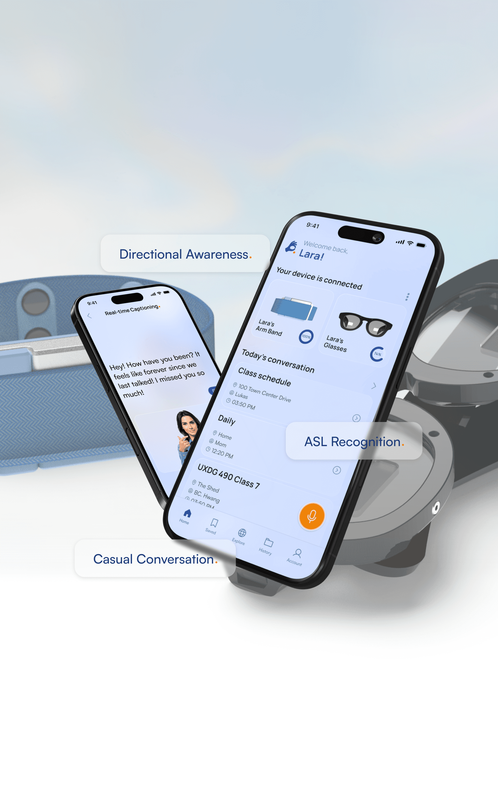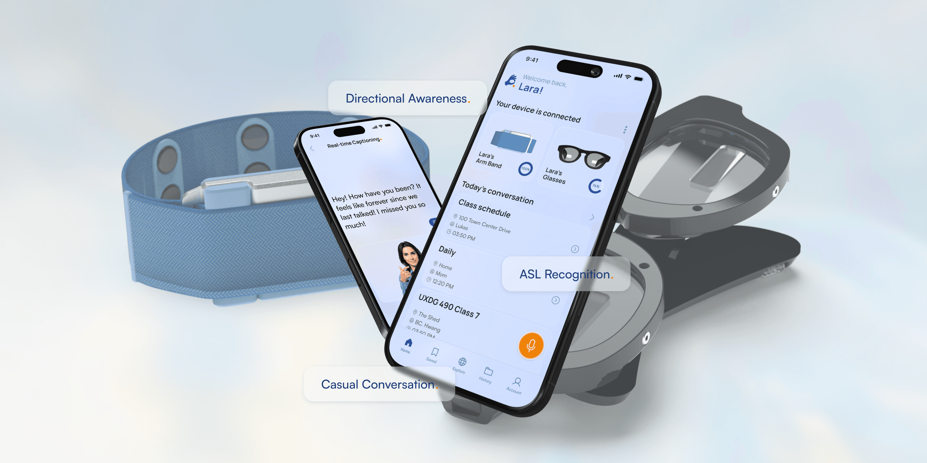 Our wearables enhance our app’s capabilities. Woori, our smart ASL armband, uses IMU and EMG data to let users respond by signing, paired with saved ASL terms. Sari, our smart glasses, keeps conversations phone-free with an embedded display and discreetly indicates sound sources for environmental awareness.